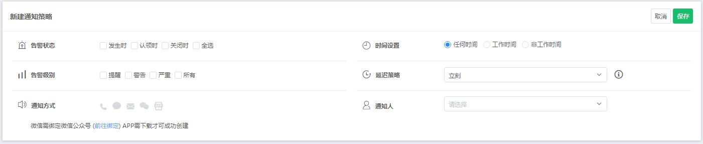 通知策略:设置的是通知的方式;目前支持的通知方式有电话、邮件、APP、短信告警等;用户也可选择多种筛选条件通知。