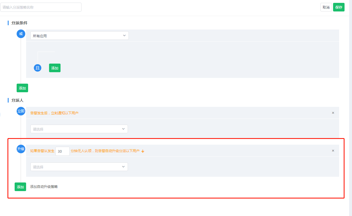 为了避免告警的遗漏或者是某些特殊原因未通知到,用户可以设置分派升级策略,设置好后,在指定时间内,告警如果没有被认领或者关闭,就会通知到第二责任人,分派升级策略可以设置多个,取决于用户需求。