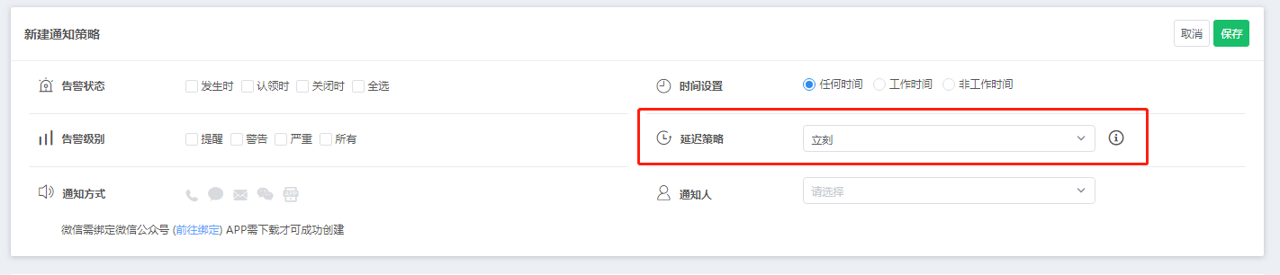部分告警可能存在高频,但是一定时间后就会恢复的告警,这类告警用户只希望显示告警,不通知;对于这样的需求,用户可以设置延迟通知策略,例:设置延迟时间为10分钟,那么10
