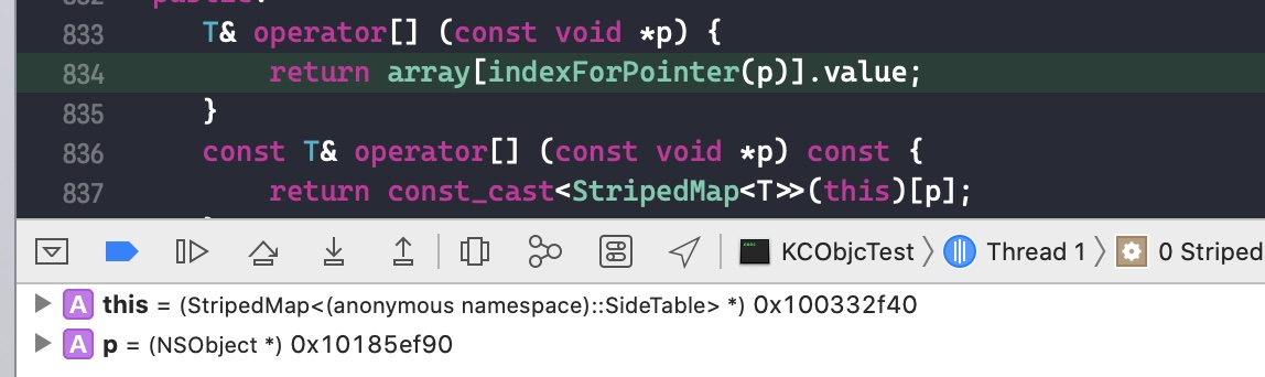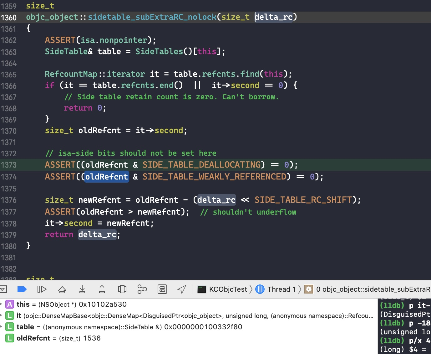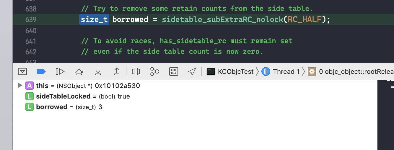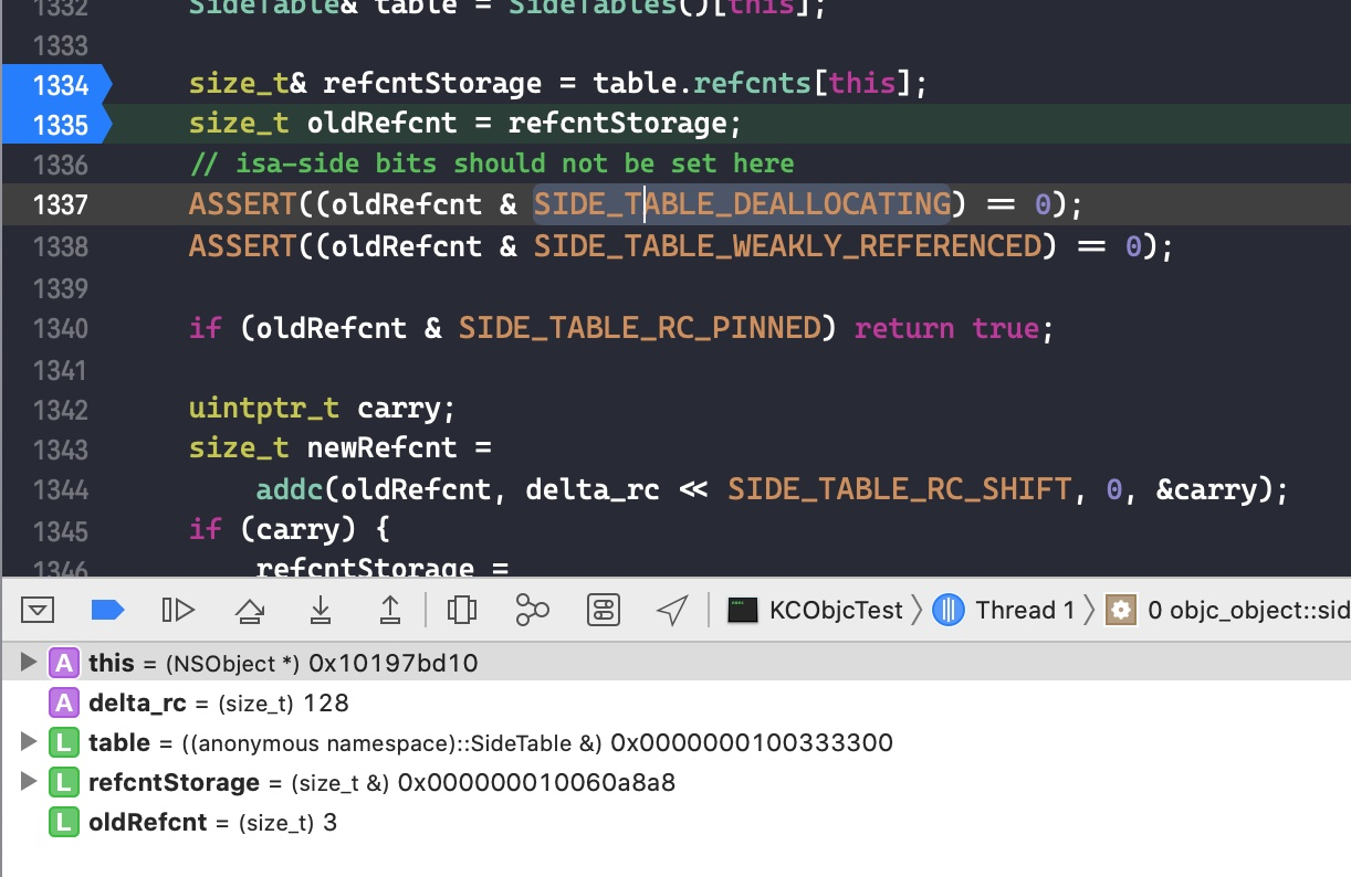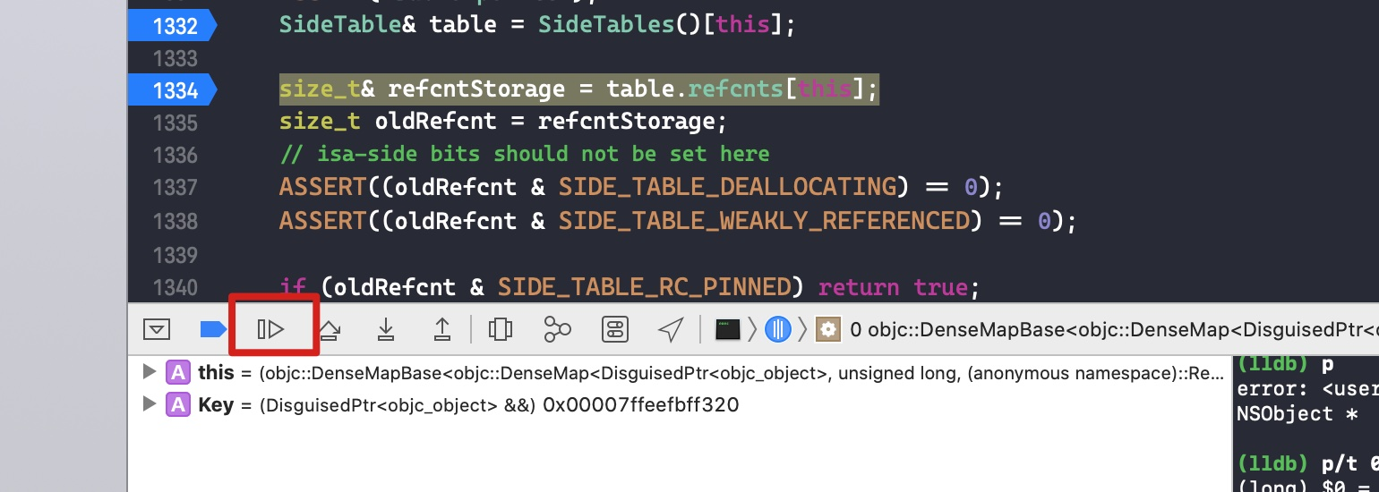 接下来在代码size_t oldRefcnt = refcntStorage;中打个断点,点击 continue program execution 跳转过去。