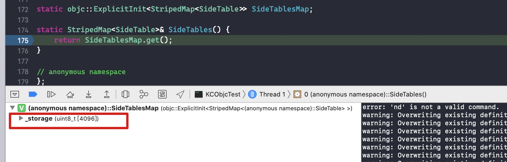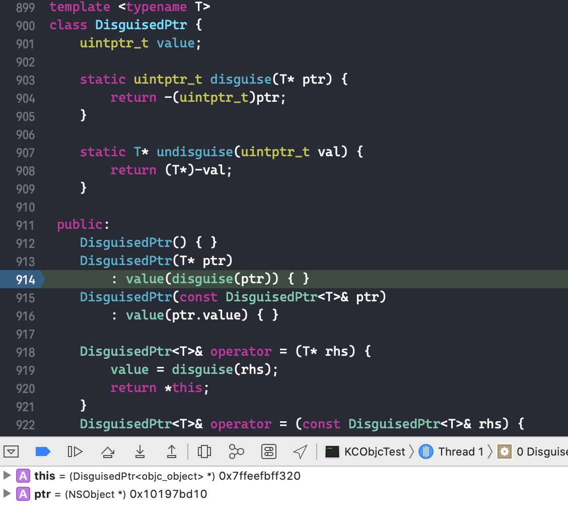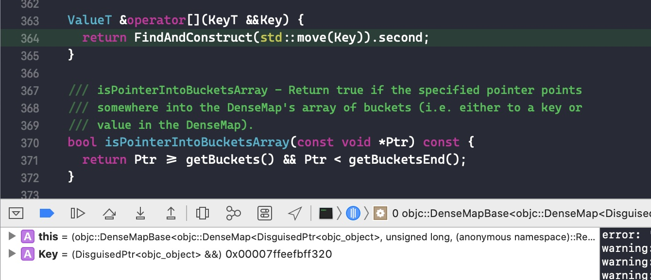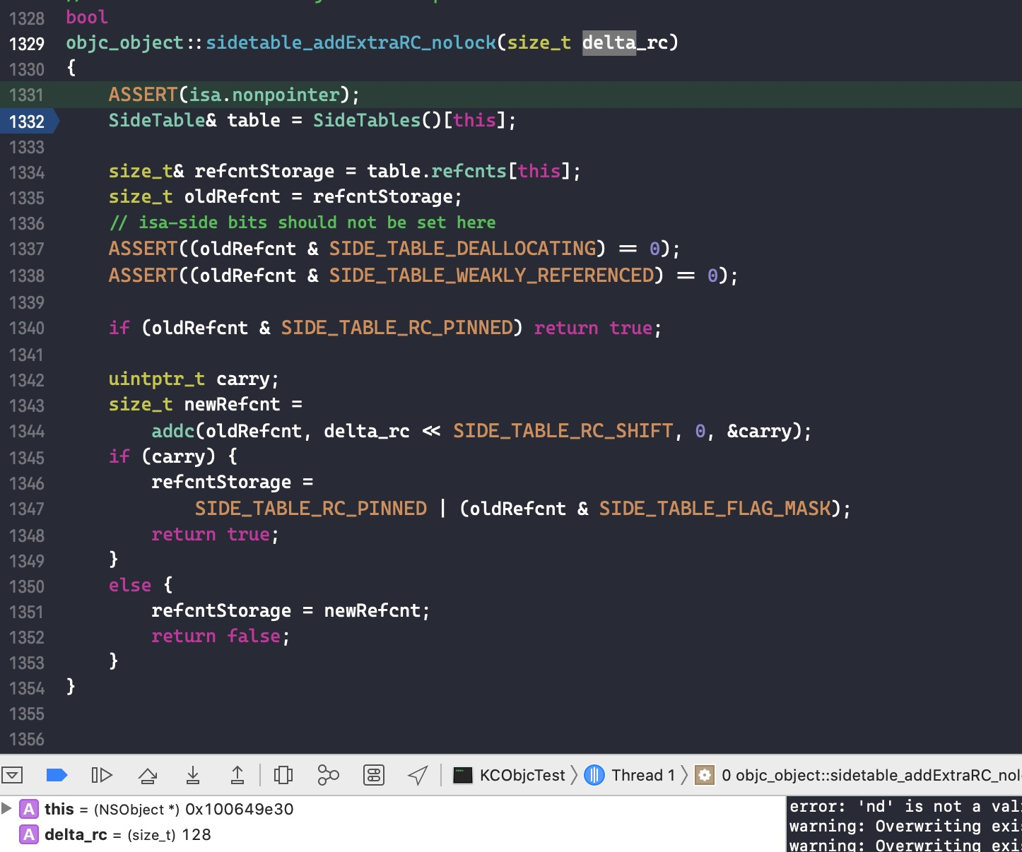 接下来在代码size_t oldRefcnt = refcntStorage;中打个断点,点击 continue program execution 跳转过去。