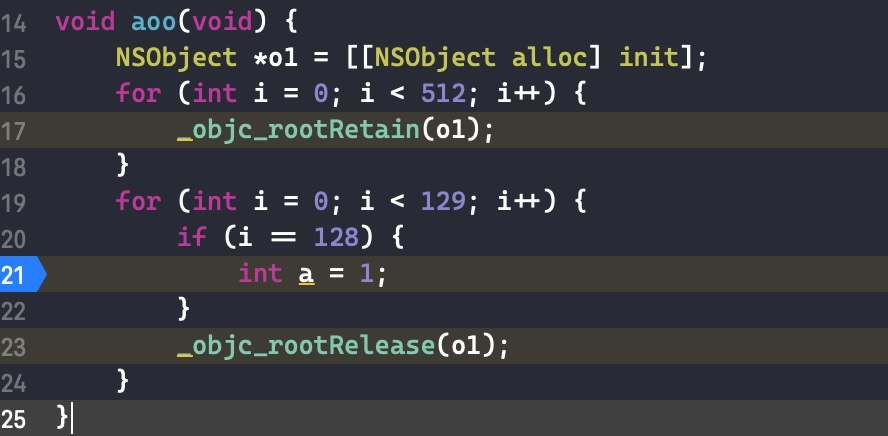 因为是在模拟器中运行的,isa 使用 8 个 bit 来存储引用计数, 即在 isa 中只能存储不超过 256 的数目。所以我们只要将对象的引用计数增加到 256 以上,那么系统就会将多余的引用计数存储到Side Table。