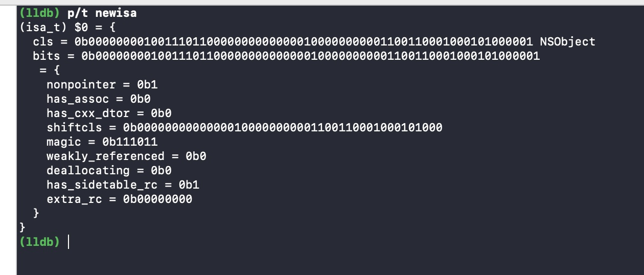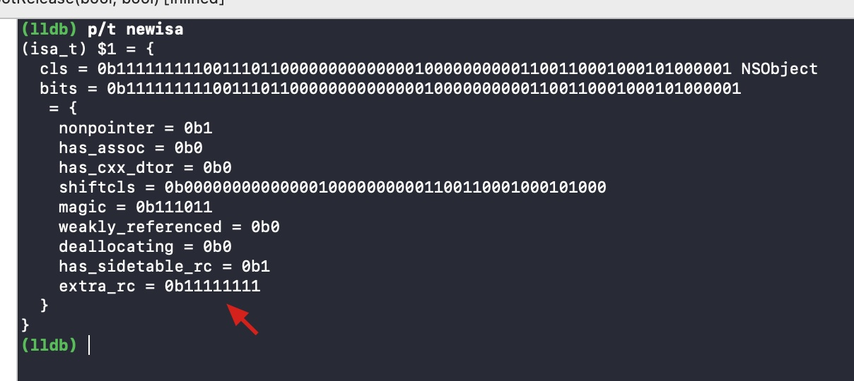 因为使用的是模拟器,所以 isa 里面只有最高的 8 个bit用来保存引用计数,之前我们减少它的引用计数 128。所以此时它 isa 指针里面保存的引用计数为 0。调试输出结果extra_rc也为0,符合预期(0b是二进制符号)