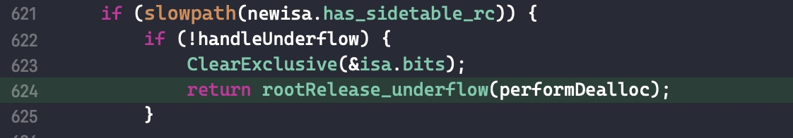 rootRelease_underflow最终调用的还是objc_object::rootRelease()函数,只不过参数 handleUnderflow 变成了 YES。