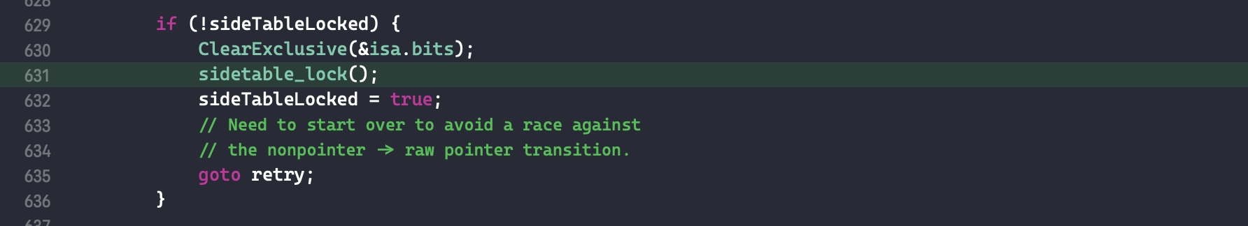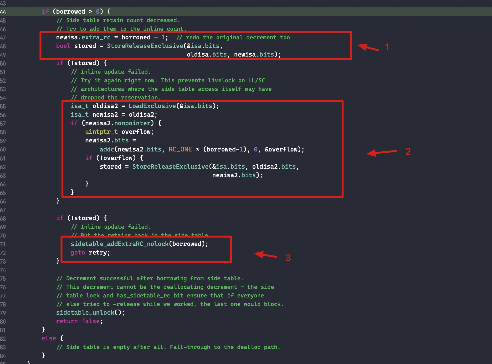 - 如果代码块2保存失败了, 则将从 sidetable 取出的引用计数重新放回去. 然后又跳回到 retry 部分