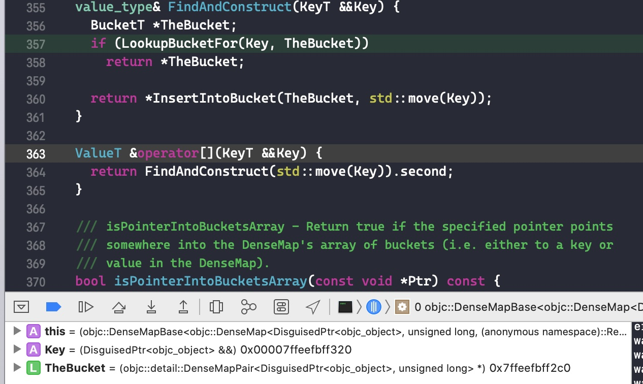 接下来的代码作用就是判断保存在 bucket 中的引用计数是否合理, 如何合理的话则将原有的数据减去RC_HALF并重新保存. 点击 step out 返回之前的函数