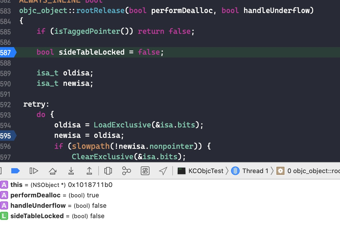 在代码int a = 1;处打个断点,此时 isa 保存的引用计数为 0。一直 step over,直到跳转到objc_object::rootRelease(bool performDealloc, bool handleUnderflow)函数。