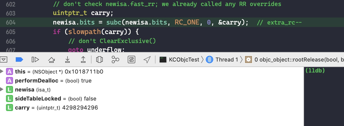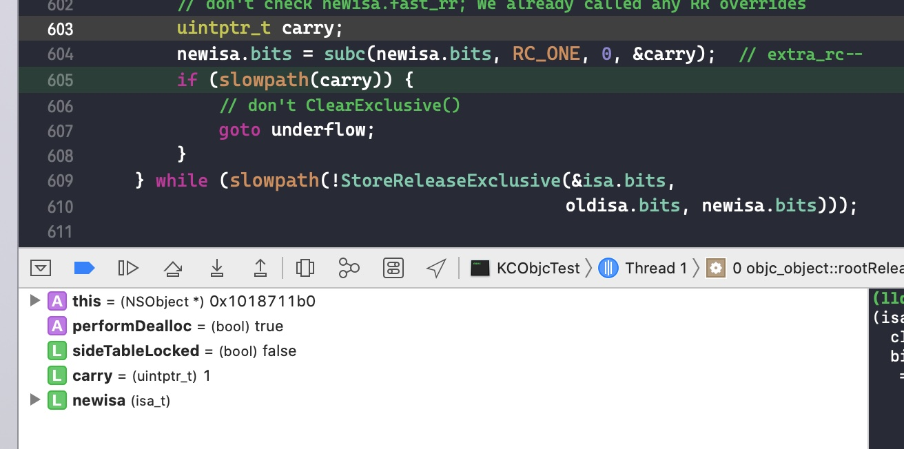 接下来系统要将引用保存在 isa 指针的引用计数 -1,并判断是否溢流。此刻它的引用计数已经为 0 了,那么对它进行 -1 操作会发生什么呢?我们接着调试,点击 step over