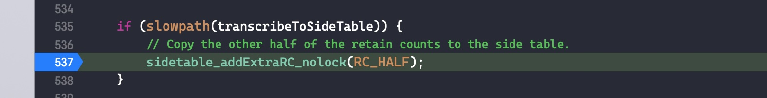 之前引用计数溢出时,我们将RC_HALF数目的引用计数存储到了sidetable当中,此时因为溢流,所以我们从sidetable中取回同样数目的引用计数。