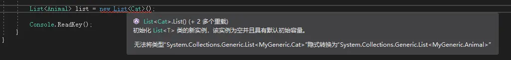 1 List<Animal> list = new List<Cat>();可能有人会认为是正确的:因为一只Cat属于Animal,那么一群Cat也应该属于Animal啊。但是实际上这样声明是错误的:因为List<Cat>和List<Animal>之间没有父子关系。