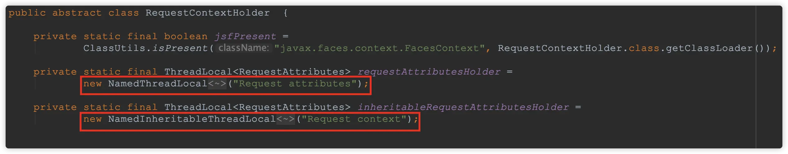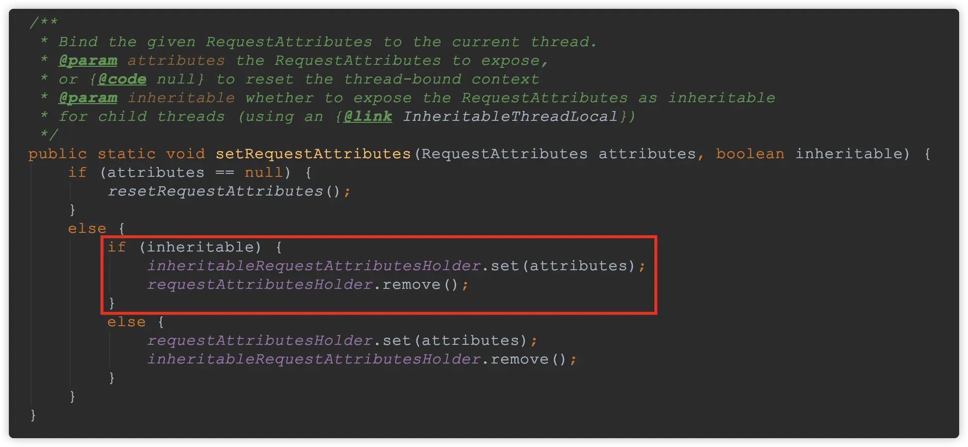 这里就可以看到今天的主角InheritableThreadLocal,再往下看RequestContextHolder提供了一个setRequestAttributes()方法,看下源码: