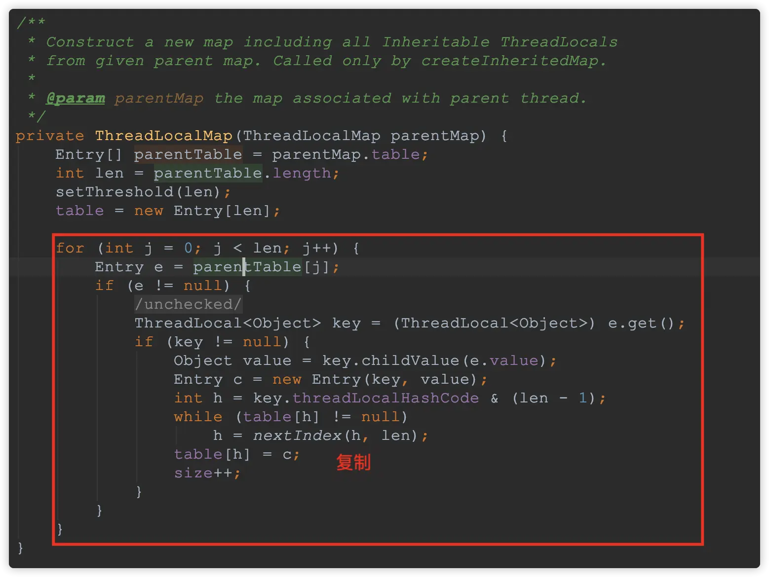 Thread中有一个init方法,每次创建线程的时候会执行这个init方法,并且inheriThreadLocals默认传的参数是true,所以当前线程对象每次都会从父线程继承值,子线程将父线程中的table对象以复制的方式赋值给子线程的table数组,这个过程是在创建Thread类对象时发生的,也就说明当子线程对象创建完毕后,子线程中的数据就是主线程中旧的数据,主线程使用新的数据时,子线程还是使用旧的数据,因为主子线程使用两个Entry[]对象数组各自存储自己的值。这个复制其实一个浅拷贝,如果存的值是可变对象的时候,只是复制了对象的引用而已,如果父线程修改对象的属性值,子线程也是可以感知到的。