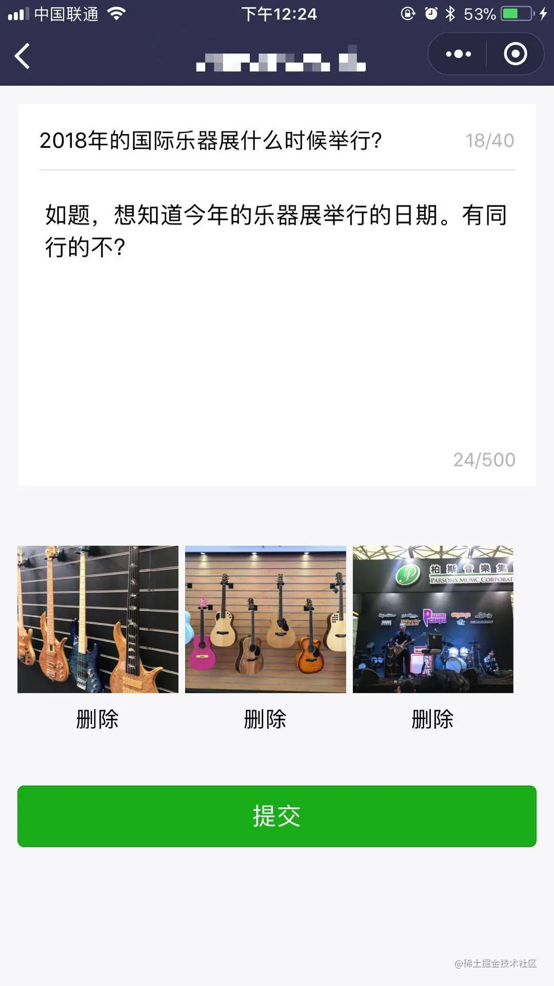 例如下图所示的应用界面,这是一个比较典型的创建帖子或问答等内容的表单,用户可以填写标题和正文,并从自己的手机相册中选择3张图片(或直接通过摄像头拍摄),且当点击缩略图时,可以全屏预览查看这些图片: