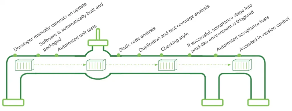 如果代码每天都被提交到版本控制中,则可以对其进行自动化测试,并且在引入代码之日会标记出任何构建、测试或集成错误,从而可以立即进行修复。这确保代码总是处于可部署和可运送的状态,称为绿色构建。