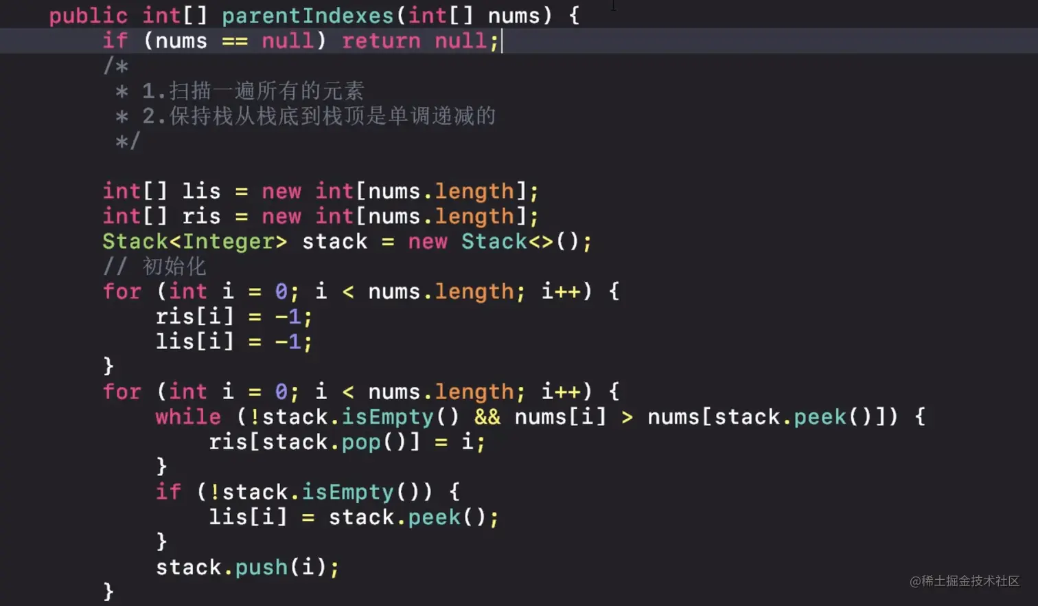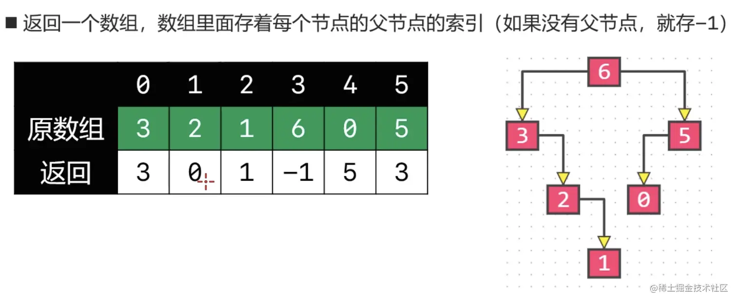 左边第一个比它大的值,右边第一个比它大的值,两者中相对较小的值,即为该节点的父节点。 - 如何通过栈实现上面的结果呢?