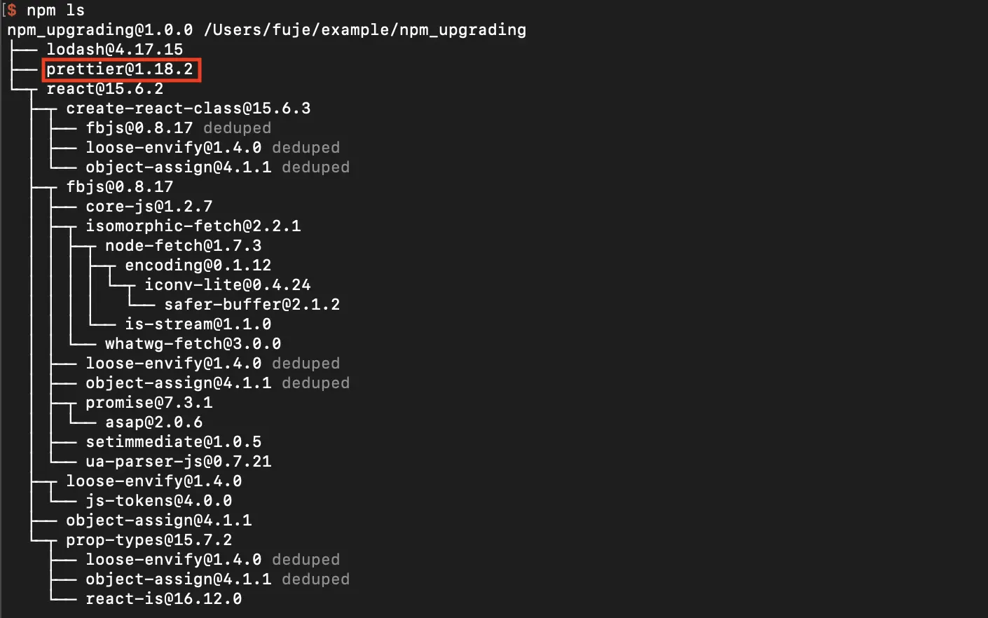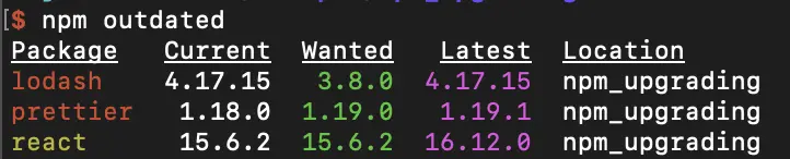 在上例中,lodash 并未过期,因此没有被列出。同时,Prettier 在 minor 位落后于最新版本了,而 React 是在 major 位。