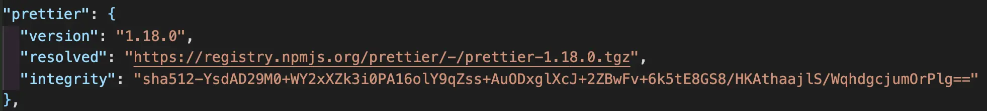 如果运行 npm install,Prettier 的版本就是足够“模糊”的,以致 package-lock.json 中会保留原来的 “1.18.0”: