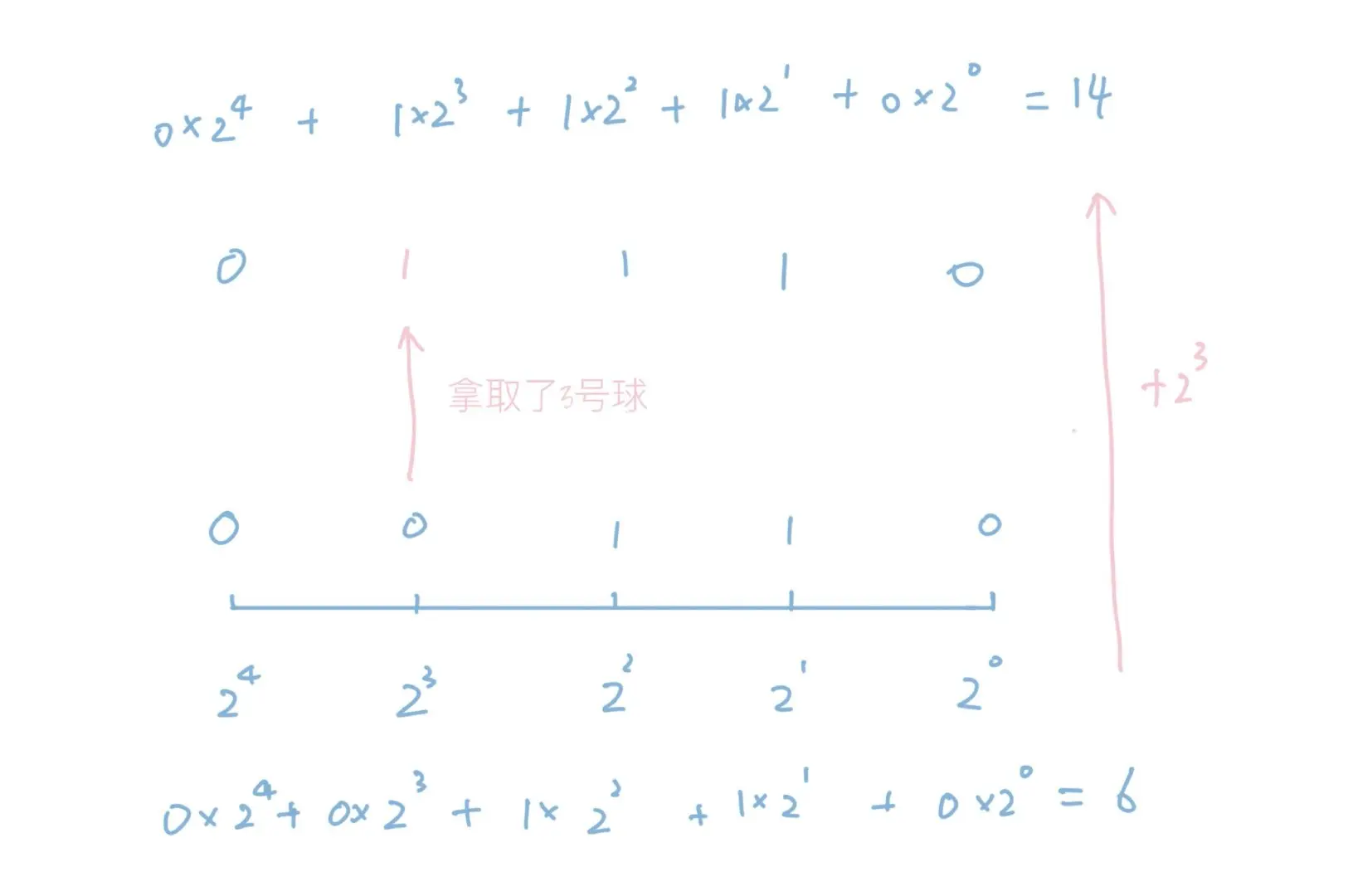 我们还用刚才的例子来举例,上面的图当中我们列举了5个二进制位,假设我们用这5个二进制位表示5个小球,这些小球的编号分别是0到4。这样一来,刚才的6可以认为表示拿取了1号和2号两个小球的状态。