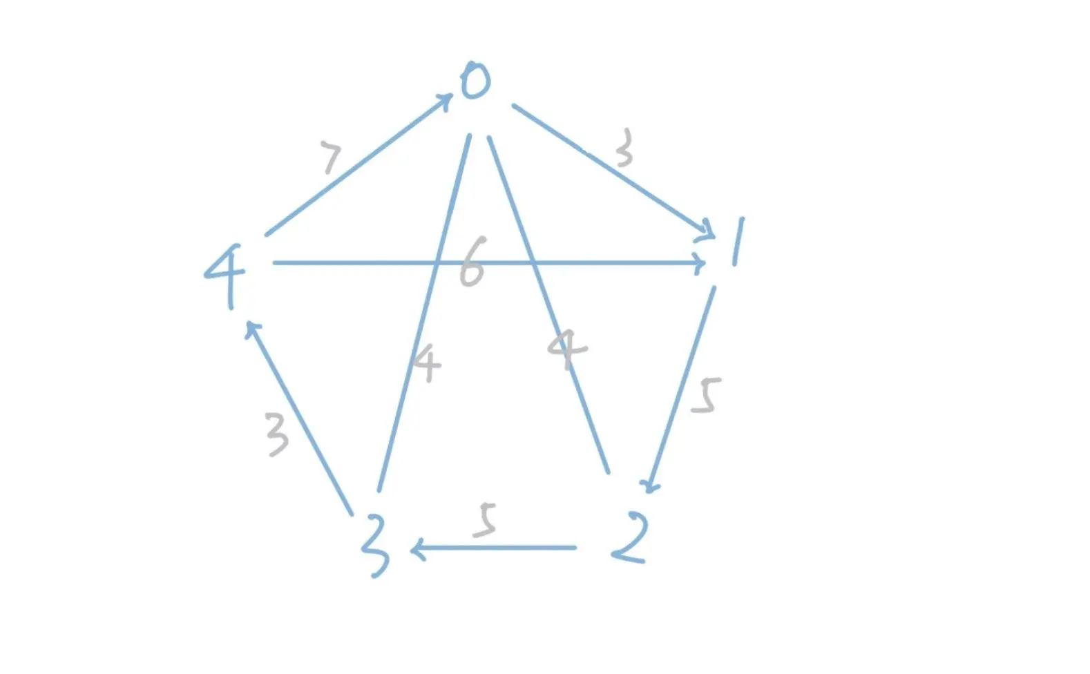edges = [[0, 1, 3], [1, 2, 5], [2, 3, 5], [3, 4, 3], [4, 0, 7], [4, 1, 6], [0, 3, 4], [2, 0, 4]]
