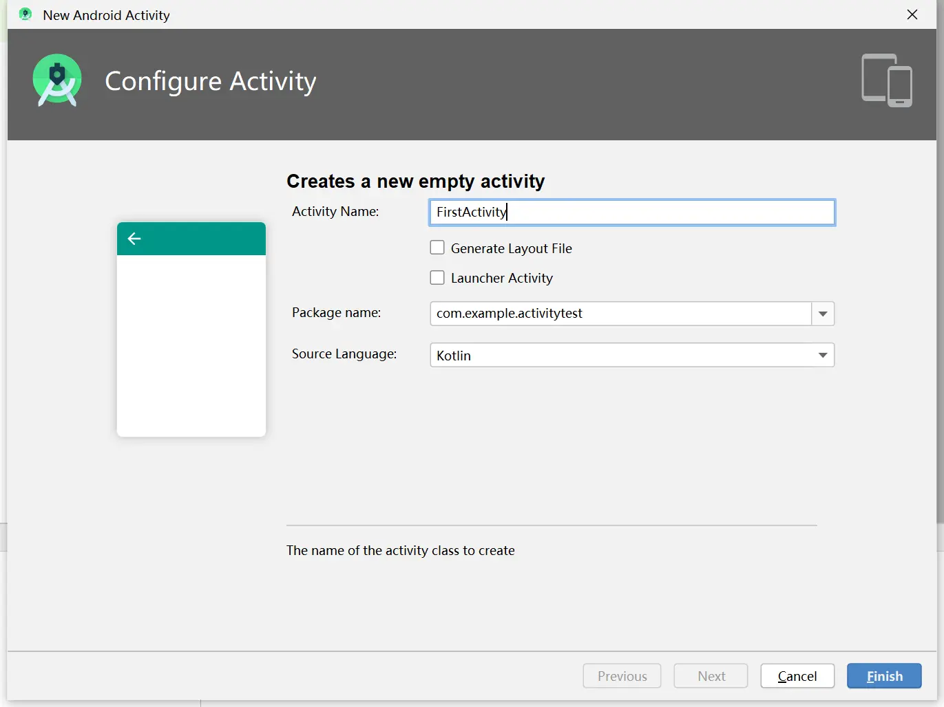 点击 Empty Activity 创建名为 FirstActivity 的 Activity