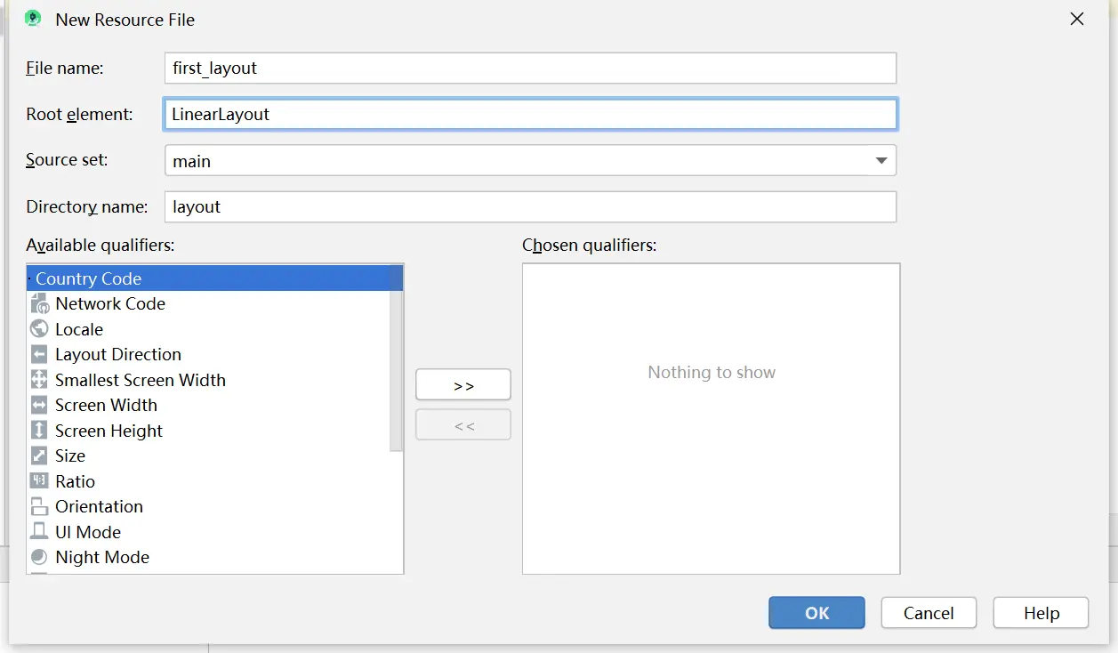 右键 app/src/main/res 目录->New->Directory,会弹出一个新建目录的窗口,现在这里创建一个名为 layout 的目录,然后对着 layout 目录右键->New->Layout resource file,优惠弹出一个新建布局资源文件的窗口,我们将这个布局文件命名为first_layout,根元素默认选择为 LinearLayout。