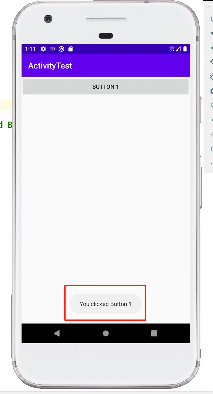 在 Activity 中通过 findViewById 找到布局文件中定义的元素,由于该方法会返回一个继承自 View 的泛型对象,因此 Kotlin 无法推导出得到的是什么类型的控件,所以需要将 button 显式的声明为 Button 类型,接着通过 setOnClickListener 注册一个监听器,点击按钮就会触发 onClick() 方法,所以在此书写代码逻辑,创建 Toast 首先需要传入三个参数,第一个是 Context,在这里传入 this 即可,第二个参数是显示的文本内容,第三个参数是 Toast 显示的时长,点击按钮后会有如下效果: