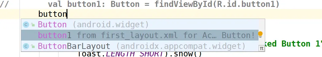 上面的代码实现是通过findViewById找到的控件,但是当控件过多时就会频繁的写这段代码,在使用 Java 开发时因为无法避免这种写法所以产生了 ButterKnife 之类的第三方开源库,但是在 Kotlin 中这个问题就不复存在了,因为使用 Kotlin 编写的 Android 程序在 app/build.gradle 文件中引入了 kotlin-android-extensions 插件,这个插件会根据布局文件中定义的控件的 id 自动生成一个具有相同名字的变量,我们可以直接使用,从而替代 findViewById。