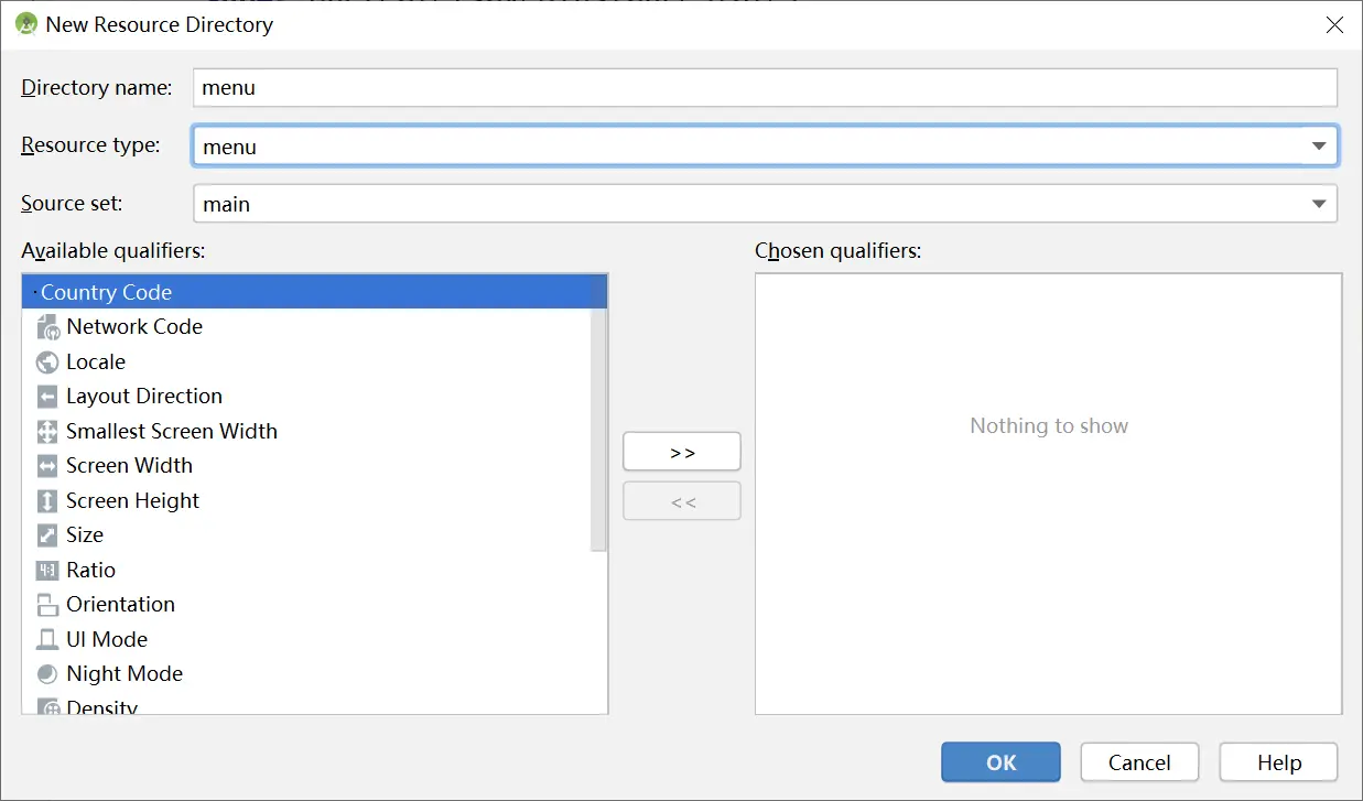 创建 menu 类型的文件夹,并创建 menu resource file 命名为 main