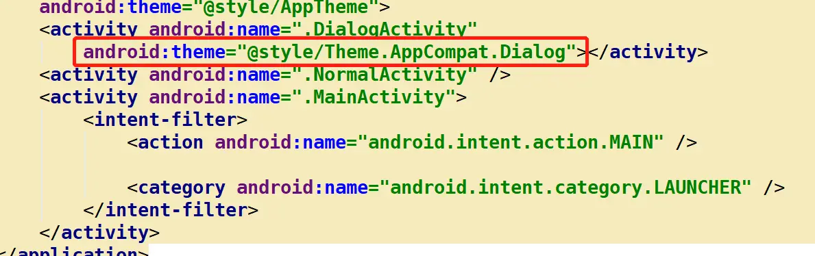可以看到,Activity 的注册声明要放在 <application> 标签中,这里通过 <activity> 标签来对 Activity 进行注册。在<activity>中通过 name 属性指定具体注册哪一个 Activity,那么这里填入 .FirstActivity ,前面加 “.” 是因为最外层已经声明了 package 属性,在 name 的地方添加.FirstActivity 即可通过全类名找到 FirstActivity。