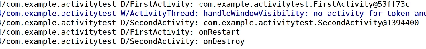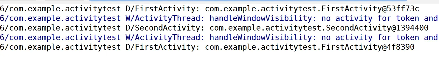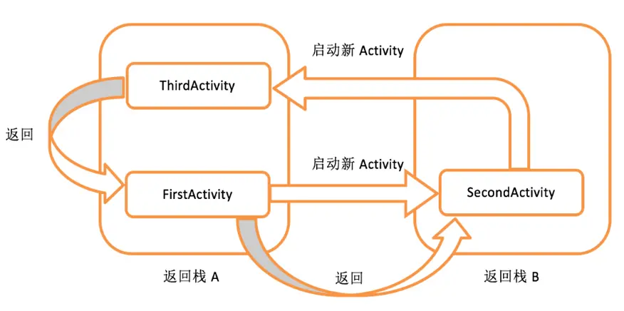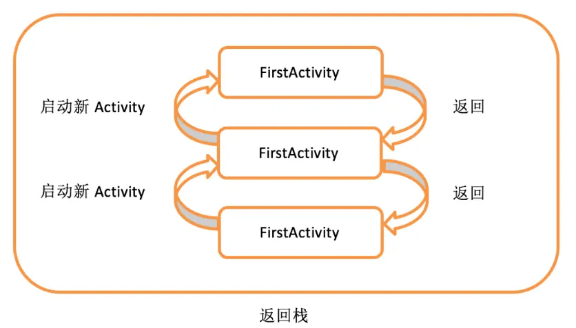 点击 back 键后会发现直接返回到了 FirstActivity 中,再按 back 会返回到 SecondActivity,再次返回才会退出应用程序。产生这种结果是因为 FirstActivity 和 ThirdActivity 处于同一个返回栈,当这个返回栈为空后于是就会显示另一个返回栈栈顶的 Activity。