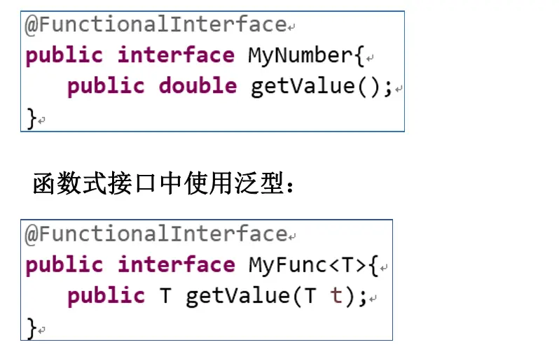 - 我们可以在一个接口上使用 @FunctionalInterface 注解,这样做可以检 查它是否是一个函数式接口。同时 javadoc 也会包含一条声明,说明这个 接口是一个函数式接口。