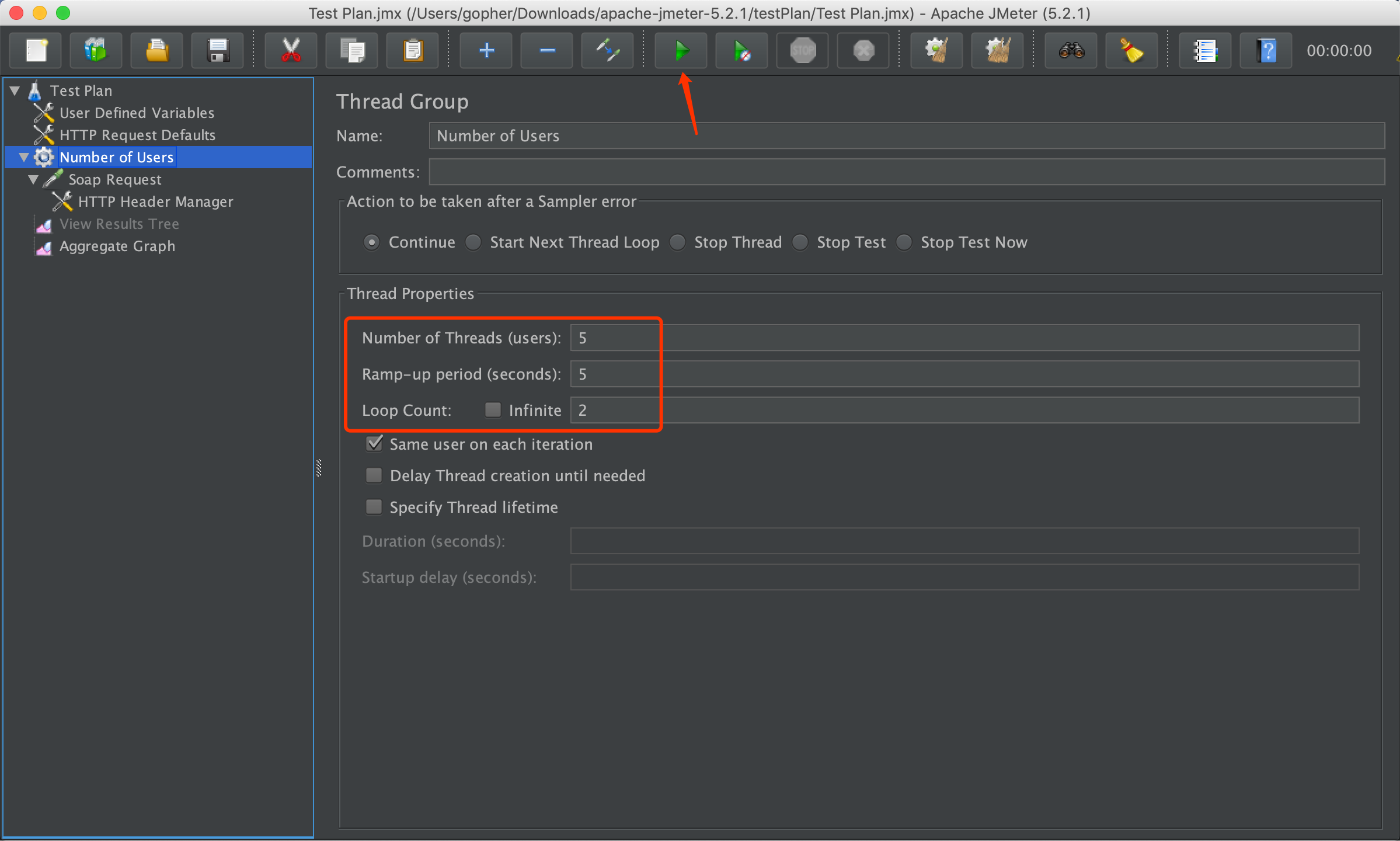 | Loop Count | 每个线程执行请求的次数。 执行请求的总数=Number of Threads * Loop Count |
