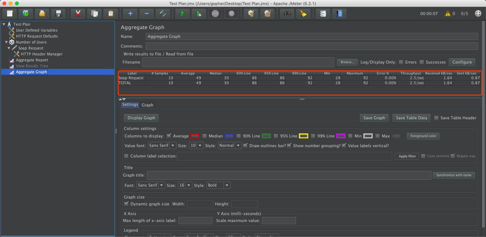 可以看到,在线程总数=5,加速时间=5s,每个线程执行请求=2的情况下,这个接口的平均响应时间为49ms,最小响应时间为28ms,最大响应时间为92ms。