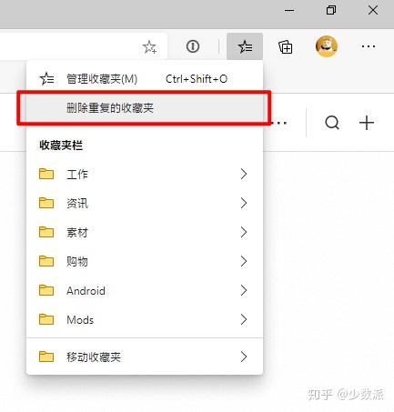 使用这个功能的方法非常简单。你可以通过点击工具栏中的收藏夹图标,然后选择「删除重复的收藏夹」按钮的方式来进行去重,也可以进入 Edge 浏览器的收藏夹管理页面(地址栏输入 edge://favorites/ 或使用快捷键 Ctrl+Shift+O),然后在页面左下角找到并点击「删除重复的收藏夹选项」。