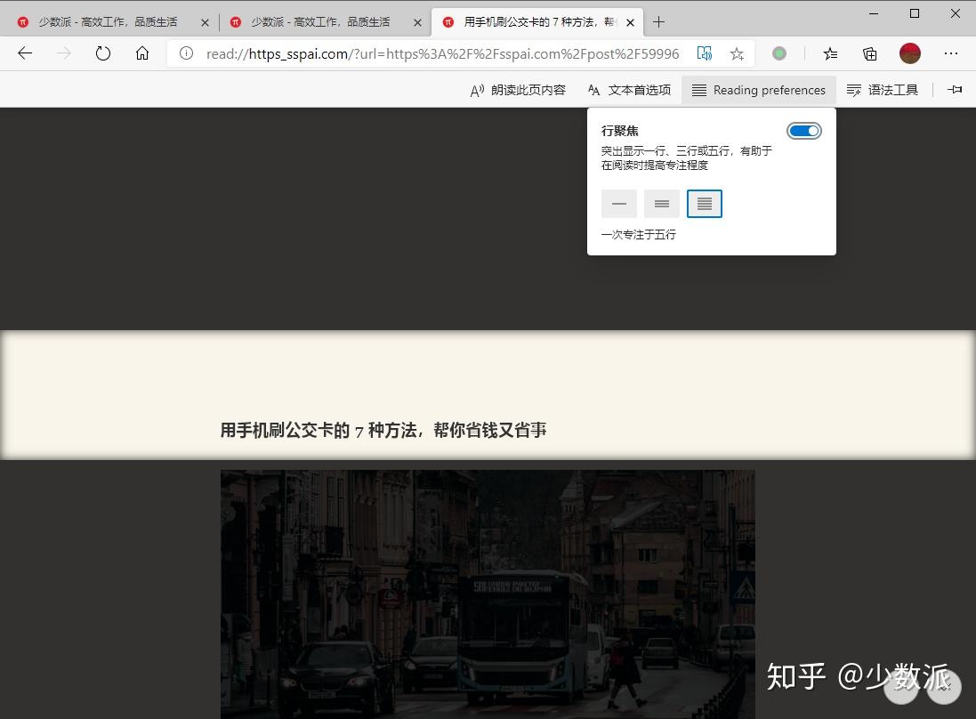 最后,在使用沉浸式阅读器的过程中,我们现在还可以开启「行聚焦」模式。该模式会将页面中的部分内容进行突出显示,其余页面内容则以黑色遮罩覆盖,我们可以根据实际阅读速度和阅读习惯,手动选择行聚焦功能要突出显示的内容区域(一行、三行或五行)。这个功能非常适合阅读大量、密集的文本内容,尤其是阅读时容易「跳行」的文献资料。