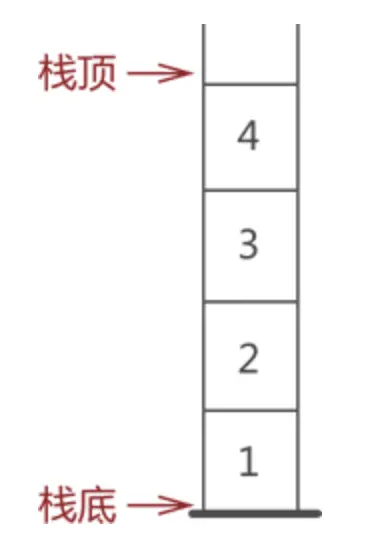 通常,栈的开口端被称为栈顶;相应地,封口端被称为栈底。因此,栈顶元素指的就是距离栈顶最近的元素,拿图 2 来说,栈顶元素为元素 4;同理,栈底元素指的是位于栈最底部的元素,图 2 中的栈底元素为元素 1。