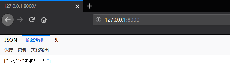 INFO 信息告诉我们已经监听了本地的 8000 端口,访问 http://127.0.0.1:8000 得到结果