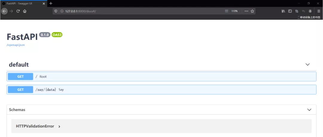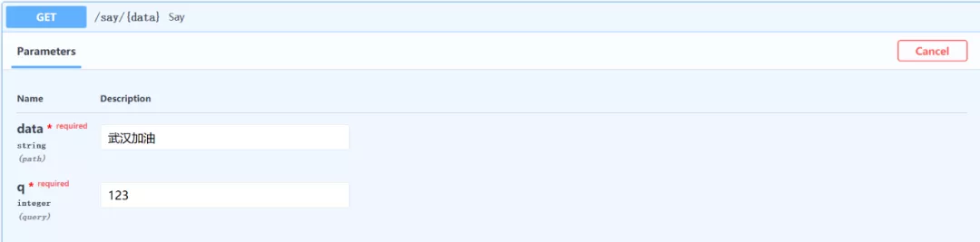 from fastapi import FastAPIapp = FastAPI() # 创建 api 对象@app.get("/") # 根路由async def root(): return {"武汉": "加油!!!"}@app.get("/say/{data}")async def say(data: str,q: int = None): return {"data": data, "q": q}开启服务后访问结果是一样的。
