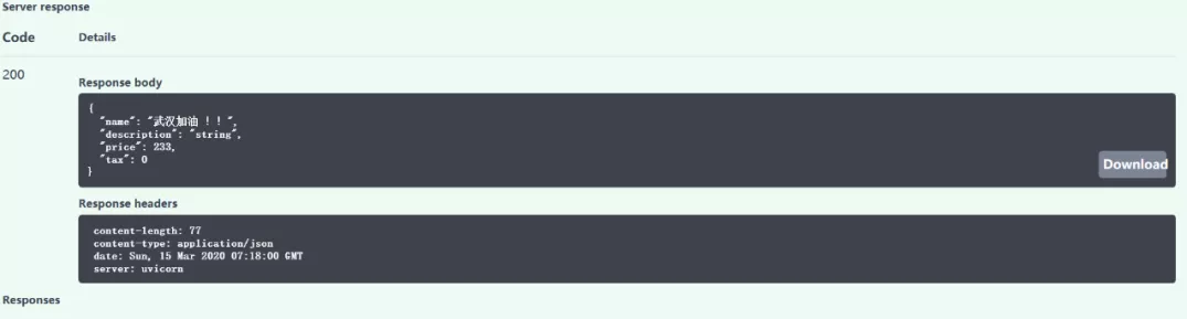 from fastapi import FastAPIfrom pydantic import BaseModel# 请求主体类class Item(BaseModel): name: str = "武汉加油 !!" description: str = None price: float = 233 tax: float = Noneapp = FastAPI()@app.post("/items/")async def create_item(item: Item): return item发送 post 请求来提交一个 Item(请求主体) 并返回,来看看提交过程。