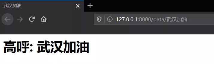 <html><head> <title>武汉加油</title></head><body> <h1>高呼: {{ data }}</h1></body></html>在浏览器键入 http://127.0.0.1:8000/data/武汉加油