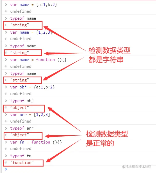 我又进行了其它的尝试,随着尝试次数增多,我终于发现了问题的症结所在:当我把变量名更换成其它的非关键字和保留字时,一切都是正常的;但是就是这个name,无论后边放的是什么,只要数据类型是引用类型值,检测数据类型的返回结果都是字符串类型。而且,我们直接在控制台输入name或者window.name时,输出了一个空字符串。