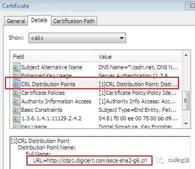 有CRL和OCSP两种检查方法。CRL即证书吊销列表,证书的属性里面会有一个CRL分发点属性,如下图所示(CSDN的证书),这个属性会包含了一个url地址,证书的签发机构会将被吊销的证书列表展现在这个url地址中;OCSP是在线证书状态检查协议,客户端直接向证书签发机构发起查询请求以确认该证书是否有效。