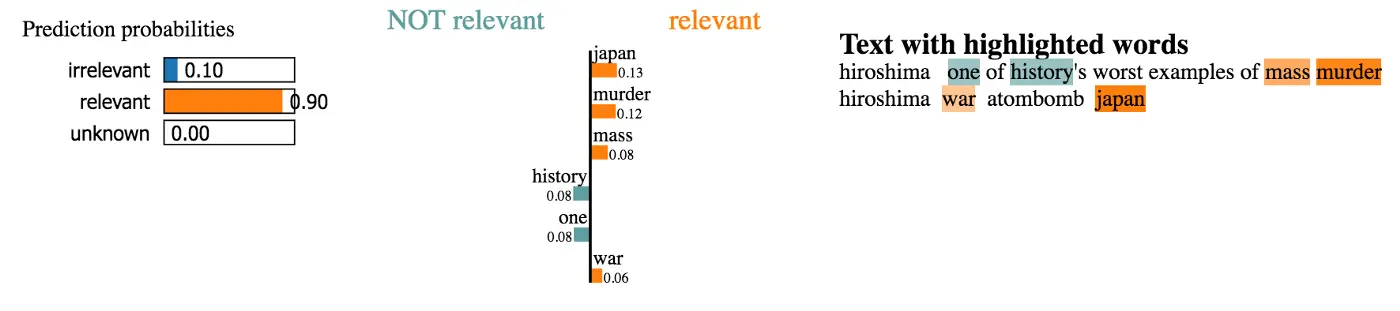 我们将数据分为一个训练集和一个测试集,分别用来训练模型和测试模型效果,测试集用来查看它对未看到的数据的泛化程度。经过训练,我们得到了75.4%的准确率。效果还不错!如果全部猜测最频繁出现的类(“无关”)只有57%。然而,即使75%的精度足以满足我们的需求,但是我们还是需要在尝试理解模型之后,再做模型的部署使用。