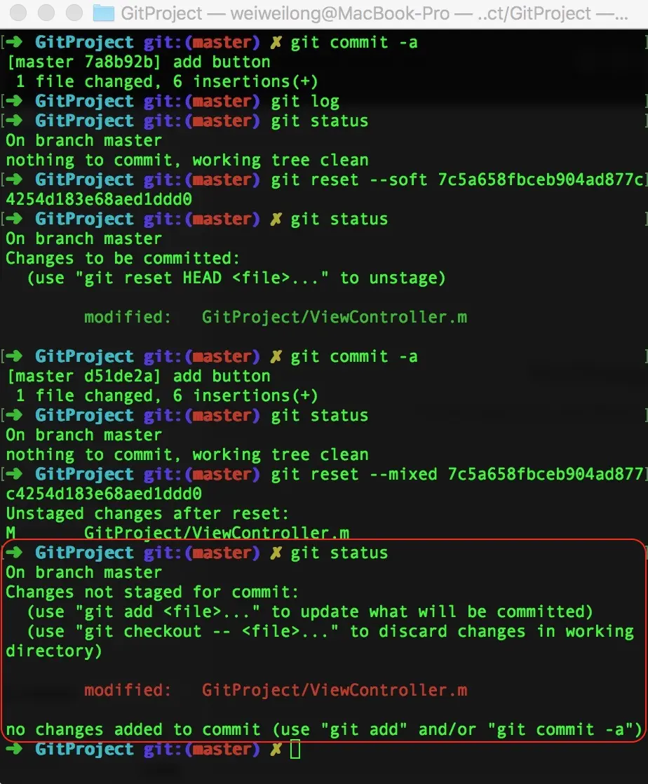同样是回滚到了add button 之前的add label 提交。被修改的文件内容也没有丢失,但是修改的文件为红色了(未执行add 操作)。