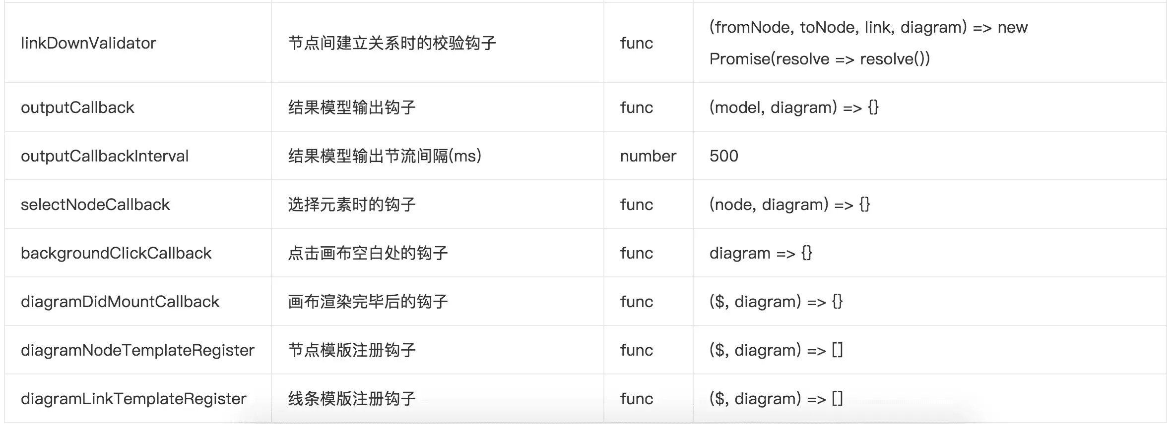 />节点之间建立关系,通过from和to来完成,这两个属性必填,其他字段都选填。另外配置里还有许多位置信息,比如point、location、segmentOffset等,不必担心,这些参数只是提供一个口子,用来精细化初始化,不是必填,如果没有这些信息,画布中会使用默认的layout来布局,并不会出现错乱情况。并且在画布上通过拖拽排版之后,组件会自动记录这些位置信息,第二次渲染就是使用这些信息来渲染,保证排版布局与用户的输入保持一致。