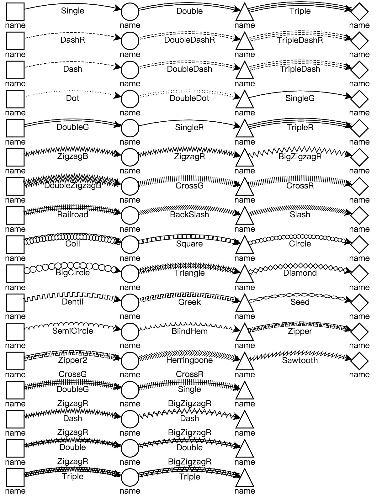 同样的,线条元素也可以通过"category"指定类型,也提供了许多类型可供选择,也可以组册自定义类型。如果不指定category或者category为'',则会使用默认模版,默认模版是黑色单线条。