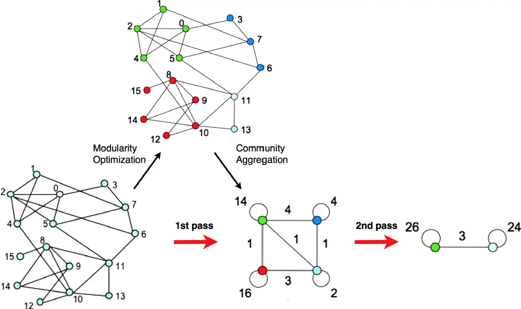 下图很好的描述了这两个阶段。第一次迭代,经过模块度优化阶段,算法将16个节点划分成4个社区;在网络凝聚阶段,4个社区被凝聚成4个超级节点,并重新更新了边权重。之后就进入第二次迭代中。
