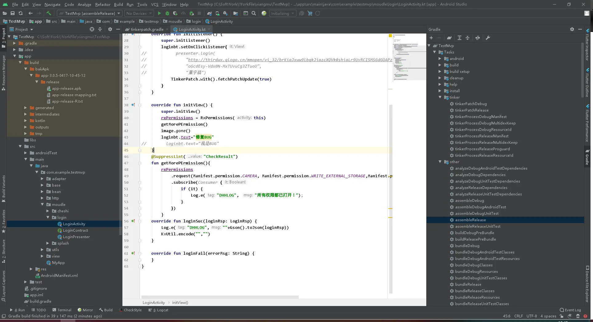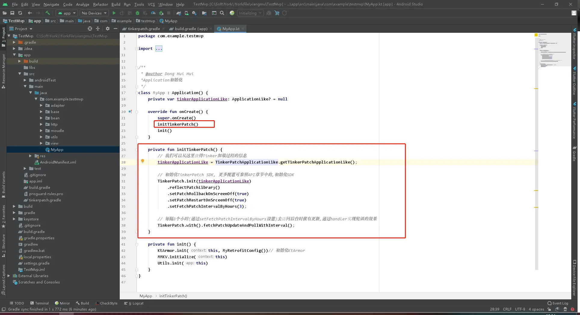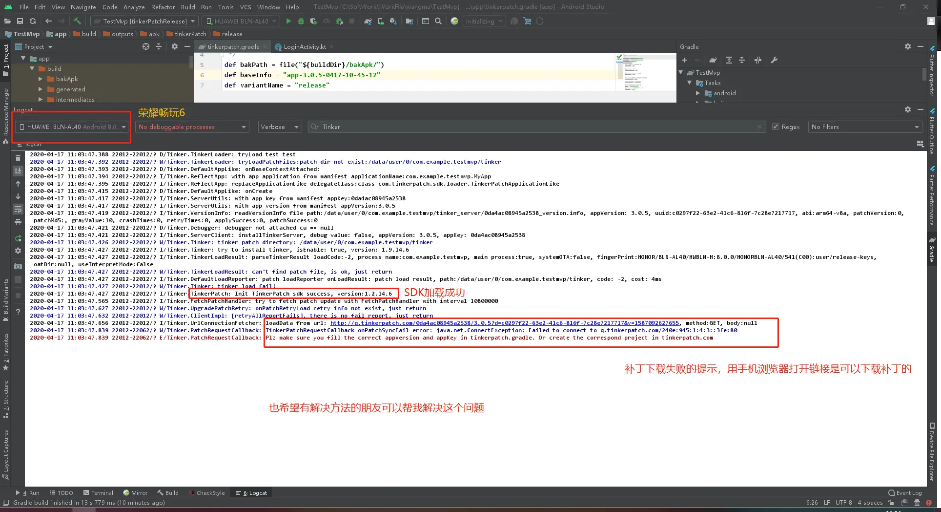 2.首先我们先说下坑再贴代码:①我集成了tinker,按照步骤进行。但是,我的手机就是不生效。经过了两天纠结问题在哪,后经人一语点醒 。换了个手机试试他生效了。