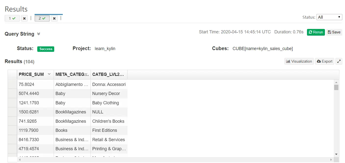 执行 select count(1) from kylin_sales 点击submit,下方会显示执行结果