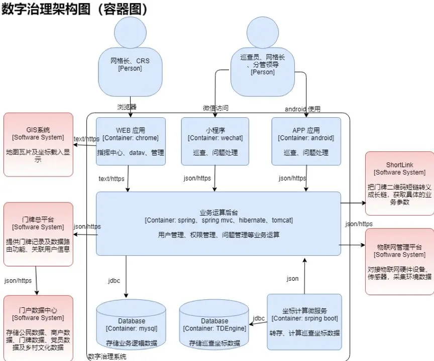 用户直接交互的是应用层,包含:浏览器的web应用、微信小程序或者android平台的APP。其中web应用还与GIS系统进行交互获取地图瓦片和坐标载入显示等信息。支撑应用层的是业务运算后台服务,包含用户管理、权限管理、问题管理等业务运算。底层存储使用了MySQL+ TDengine的配合。业务运算后台还会与其他门户数据中心的第三方服务进行交互,实现整个数字治理系统的各项需求。